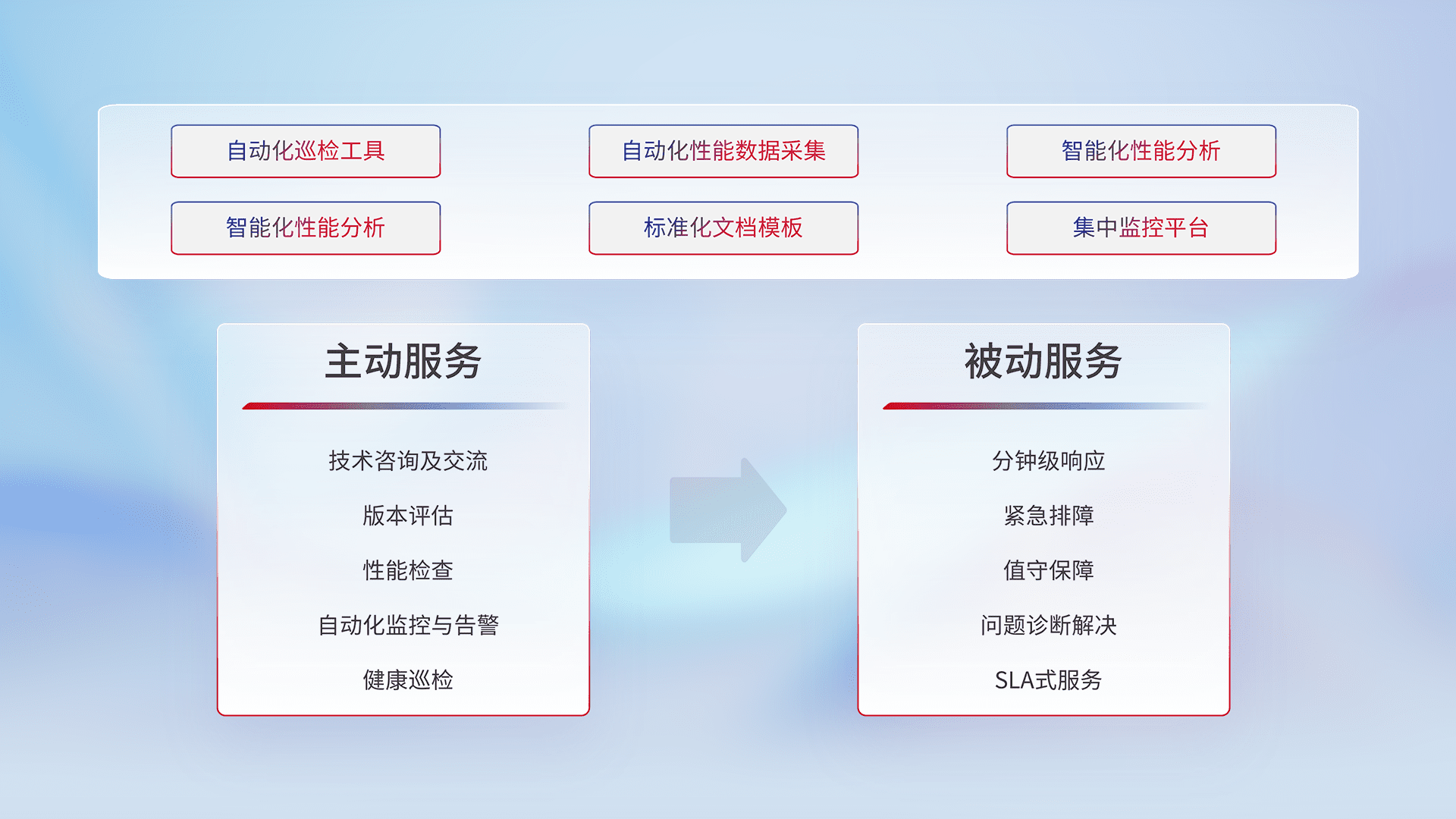 智能化工具和标准化文档,,,保障服务质量,,提供主动服务(包含技术咨询、、、版本评估、、、、性能检查、、、、自动化监控与告警、、健康巡检)和被动服务包含(分钟级响应、、紧急排障、、、值守保障、、、、问题诊断解决、、、SLA服务)。。。