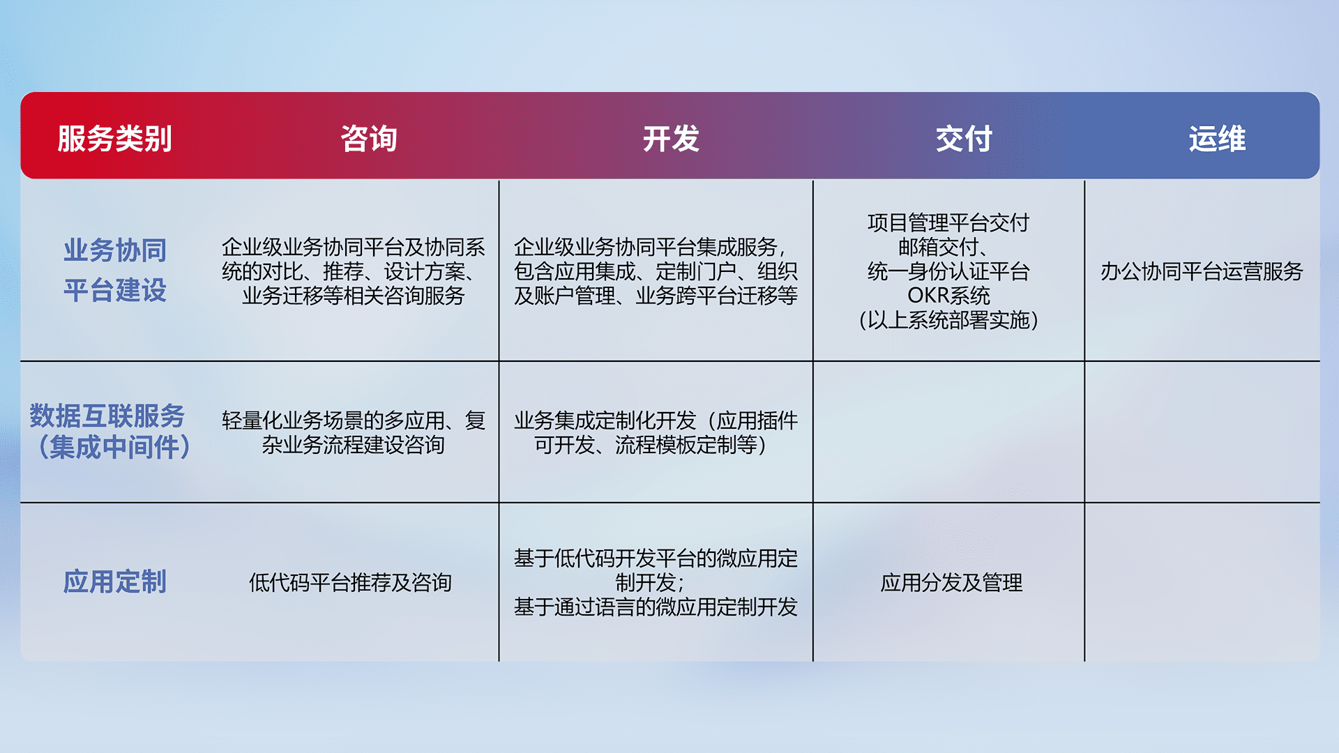 针对钉钉、、、、企微、、、、IDaas等平台级产品提供产品的规划、、、方案、、、、交付、、、定制化开发等服务,,实现如统一协同办公、、、、智能客户服务、、、、混合会议管理、、智能数据查询、、、等业务场景,,,实现数字化转型。。。
